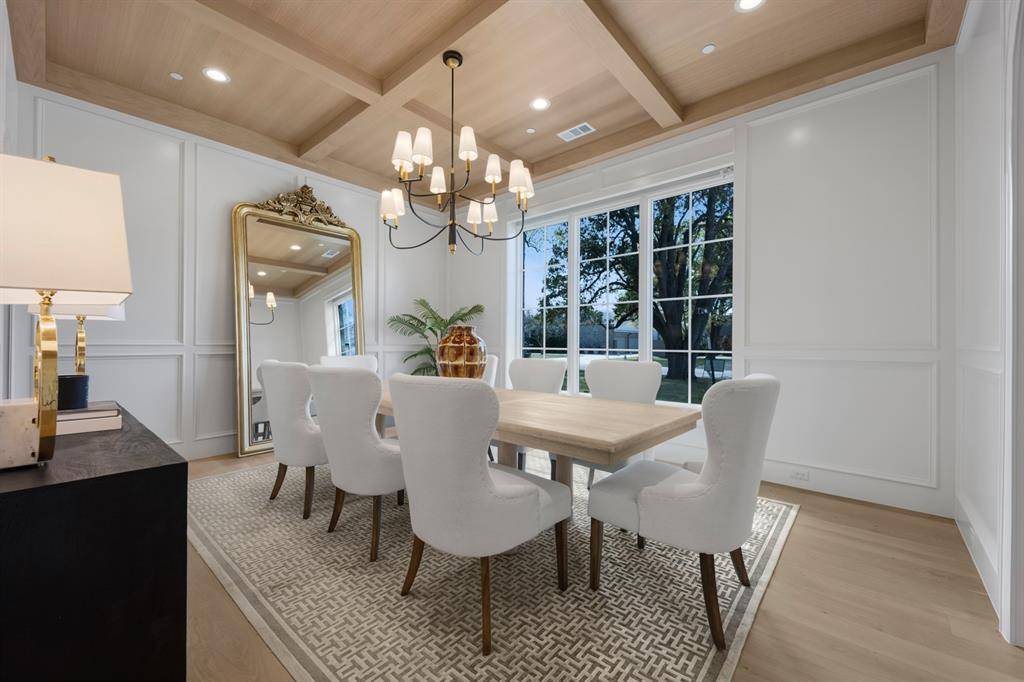 The living and dining areas transition seamlessly, with a striking wet bar and a butler's pantry detailed in glass and brass adding depth. The formal dining room, framed with classic paneling and a sculptural chandelier, feels timeless.