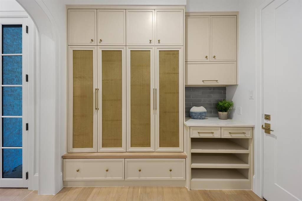 The kitchen is refined and beautifully composed. Calacatta Vagli marble surfaces, custom cabinetry, and a suite of Sub-Zero and Wolf appliances create a setting that is as functional as it is elegant. A secondary prep kitchen and walk-in pantry allow the main space to remain pristine.