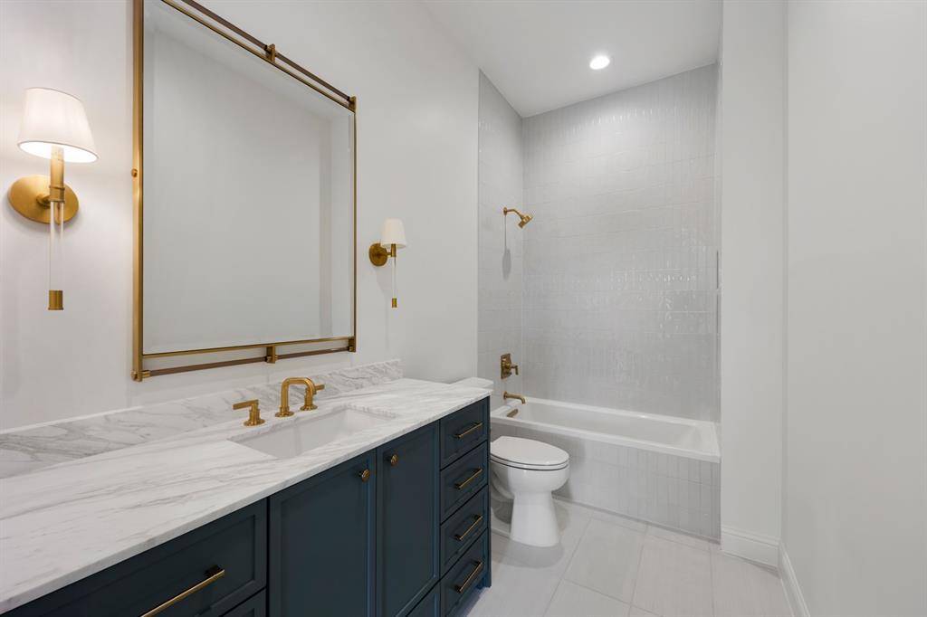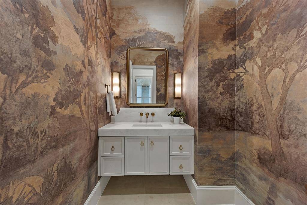 The primary bath is beautifully executed, layered in marble with Visual Comfort lighting, dual water closets, expansive closets, and a soaking tub positioned for quiet moments.