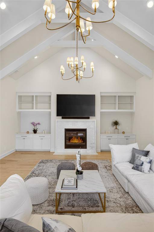 The generous downstairs owner's suite features a gas fireplace, spa-like bath, and expansive his-and-her closets. A formal office and second guest suite are also conveniently located on the first floor. The chef's kitchen is anchored by a huge island and includes a Sub-Zero refrigerator, Wolf range, two Bosch dishwashers, a large walk-in pantry, and abundant storage.