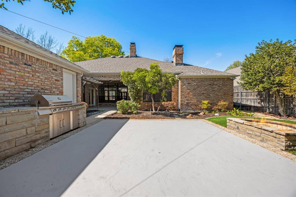Enjoy outdoor living with a large covered patio and a charming pergola, perfect for climbing roses and wisteria to create a garden retreat, along with a built-in outdoor kitchen with grill, extended concrete space, and a cozy firepit—ideal for relaxing or entertaining.