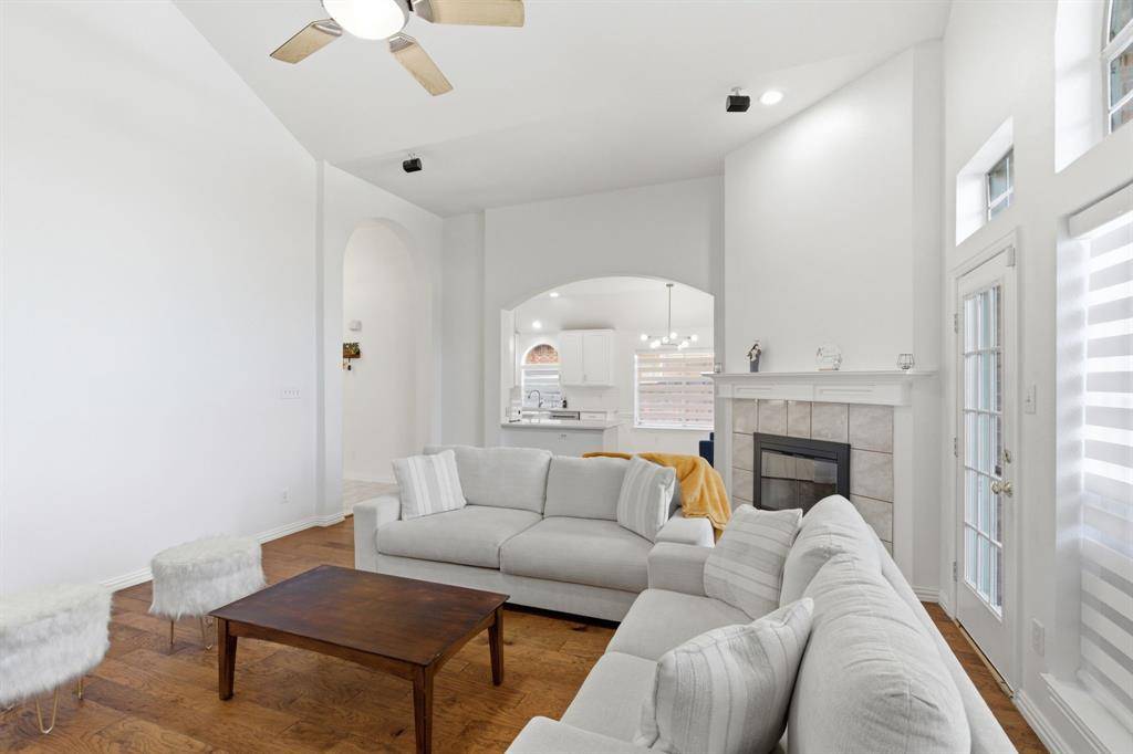 Step inside to find engineered wood flooring, abundant natural light, and spacious living areas with vaulted ceilings and a cozy gas fireplace. The kitchen is equipped with quartz countertops, stainless steel appliances, and a generous island, opening seamlessly to the main living space.